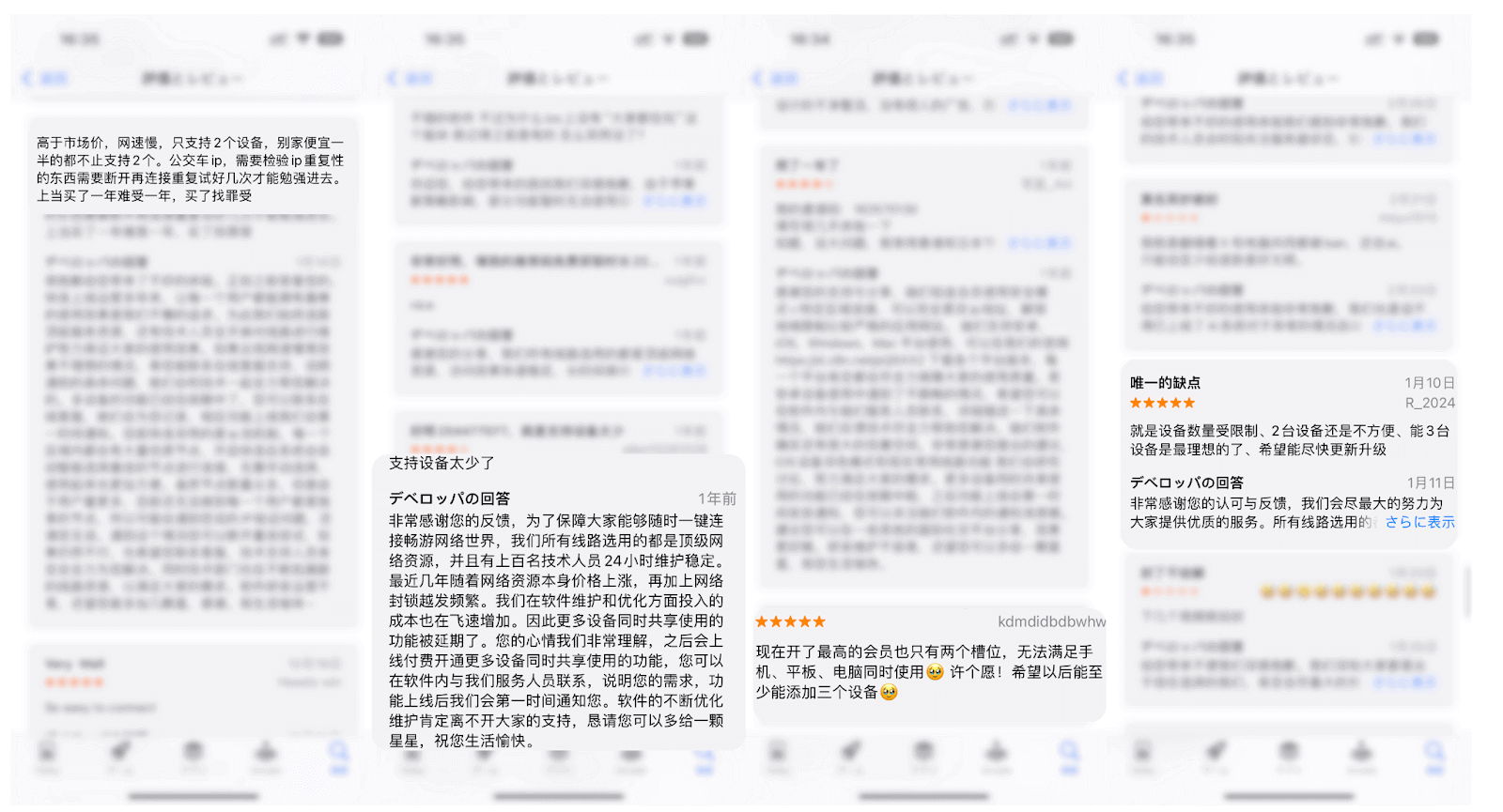 在 GooglePlay 或是 AppStore 中,绝大部分 VPN App 的评论区中讨论最多的都是关于网络速度、连接稳定性、价格等方面的内容,可如果大家翻看一下快连 VPN 的商店评论,就会发现画风不一样了,很多都是在吐槽两个设备不够用,需要多设备共享的评论。