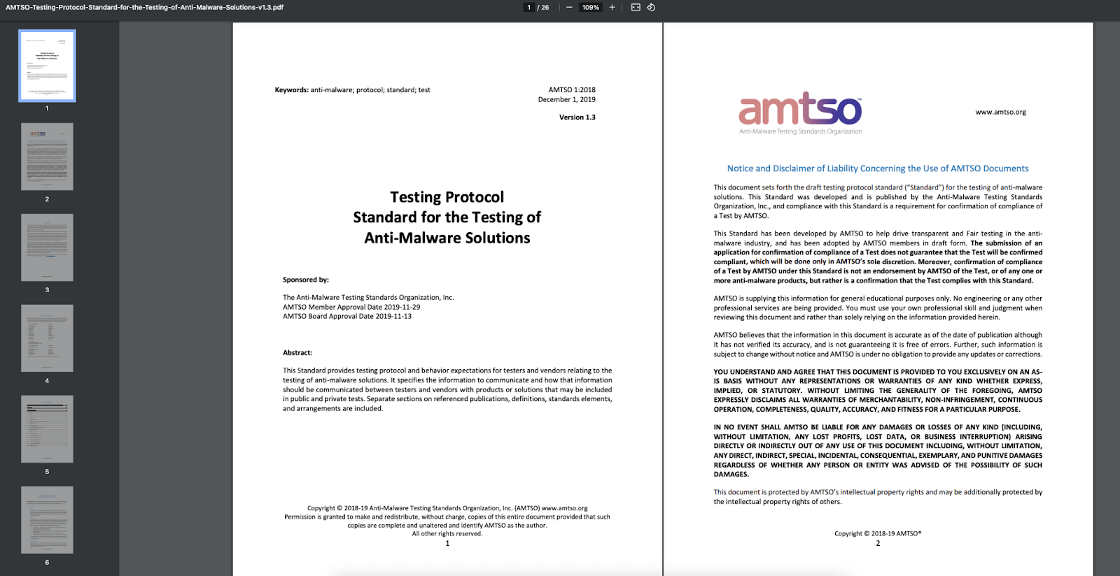 1. 首先,需要通过 AppEsteem 等 AMTSO 成员机构申请进行检测,AMTSO 的检测标准文件就有几十页,多达一百多项检测标准,必须全部通过